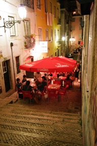 Nu vender man om og går direkte ind i Bairro Altos labyrint af gader med et utal af restauranter, sydamerikanske barer, jazz-steder, syrede forretninger og Fado-restauranter, hvorfra portugisernes drivende sentimentale bluesagtige sang siver ud på gaden. De fleste Fado-restauranter i Bairro Alto er der dog mest til ære for turisterne.