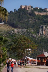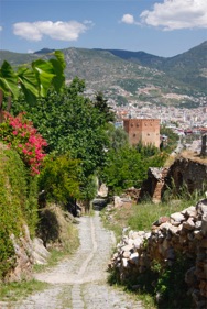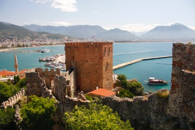 Fra toppen af borgen er der en fremragende udsigt over Alanya og de store strande omkring byen. Se fangehullet hvor fanger blev givet fri, hvis de kunne kaste en sten i vandet fra fangetårnet. Det ser let ud, prøv selv. Lykkedes det ikke, var det ud over klippen. Kør op og gå gerne en tur ned fra borgen. Heroppe ser man resterne af den gamle charmerende by. Turen er bedst uden for den værste middagshede.