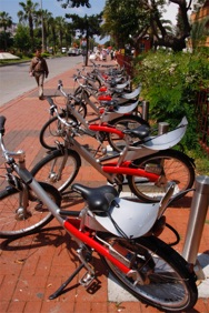 Der er ikke noget nyt i bycykler for en københavner som mig. Desværre er det langt fra kun byens gæster, der kører på dem. I Alanya har man i stedet indført et effektivt tysk system med meget flotte bycykler. Før du kan sætte dig op, skal du bruge dit kreditkort i en stander ved cyklerne. Du får så en kode til cyklen. Den første time er gratis. Derefter trækkes der på kortet, til du har sat den på plads på et af de mange stader i byen.