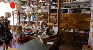 Glansbilleder, påklædningsdukker, nipsenåle, Rex, ATA skurepulver, solbærrom, bolcher og frugtsaft er en lille del af det store udvalg på over 1000 varer. Meget sælges i løs vægt. Man er velkommen bag om disken og i kontoret. Alt er ført tilbage til udseendet i 1920'erne. Butikken er en del af Roskilde Museum.