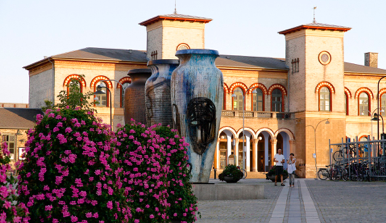 En slentretur i Roskilde kan nemt starte fra Danmarks ældste jernbanestation. I hundredetusindevis af unge har haft retning mod syd og Roskildefestivalen, men vi går vi mod nord og centrum af byen. Straks uden for stationsbygningen fra 1847 støder vi ind i de fem meter høje, farverige stenkrukker af Peter Brandes. Krukkerne leder ned til Roskildes hovedstrøg Algade.
